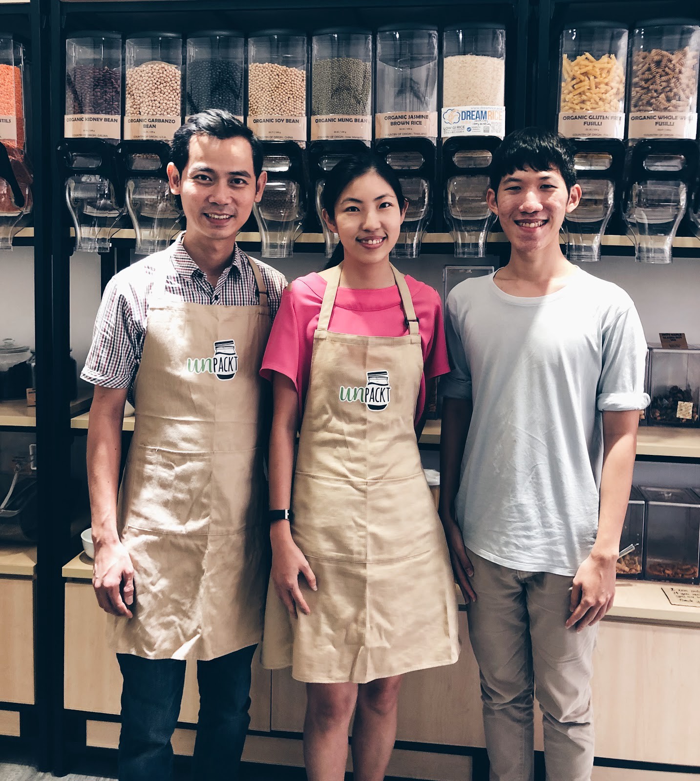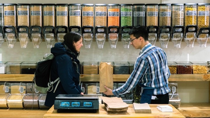 Tienes 2 opciones para comprar aquí. Uno es usando sus propias bolsas o contenedores, otro es alquilar una bolsa de compras reciclable de la tienda.